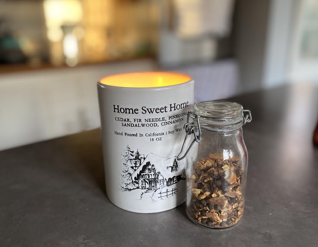 I prepared this for my love and I the weekend before I was set to have family over to the place for the first time to entertain over the holidays. When fam arrived I re-activated the magic with a “hearth fire” candle I found at Marshall’s, pictured here w the mulling spices left over.